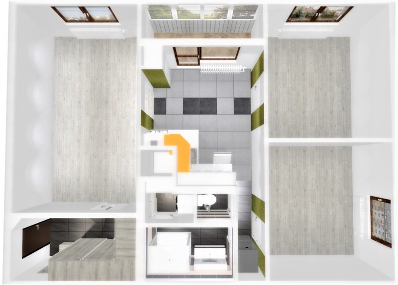 k neutrálnej sivej podlahe a obkladom a dlažbe v byte sa hodia akékoľvek farby a doplnky