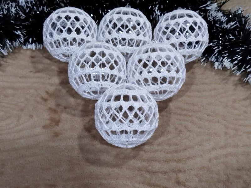 Obháčkovaná priesvitná plastová guľa o priemere 8,5 cm s uškom na zavesenie na vianočný stromček alebo vhodná len ako dekorácia. Cena za 1 kus je 3,-Eur. Doba dodania závisí od počtu požadovaných kusov.