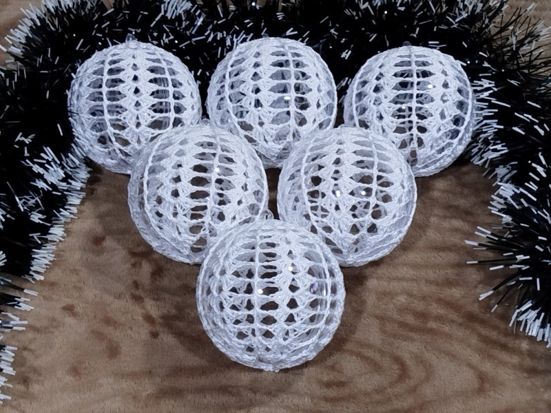 Obháčkovaná priesvitná plastová guľa o priemere 8,5 cm s uškom na zavesenie na vianočný stromček alebo vhodná len ako dekorácia. Cena za 1 kus je 3,-Eur. Doba dodania závisí od počtu požadovaných kusov.