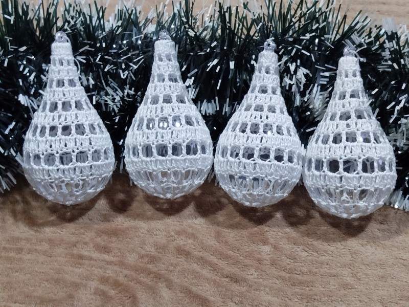 Obháčkovaná priesvitná plastová slzička o priemere 11x5,5 cm s uškom na zavesenie na vianočný stromček alebo vhodná len ako dekorácia. Cena za 1 kus je 3,-Eur. Doba dodania závisí od počtu požadovaných kusov.