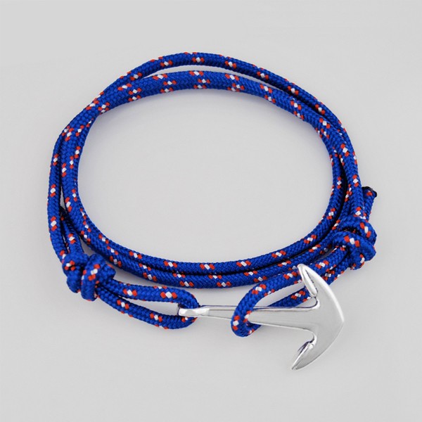 Modrý zavinovací náramok s kotvou. Tento štýlový modrý náramok z bavlny sa dá 3-krát ovinúť okolo ruky a pripevniť kotvou striebornej farby. Na náramku sa dá nastaviť veľkosť pomocou očiek na koncoch lanka, ktoré sa dajú ľubovolne posúvať, a tým sú vhodné na každú ženskú ruku. Tento dizajnový náramok s kotvou bude krásnym doplnkom pre každú ženu.