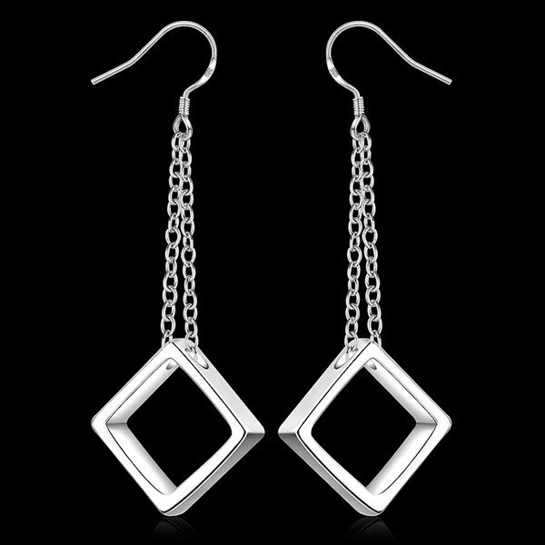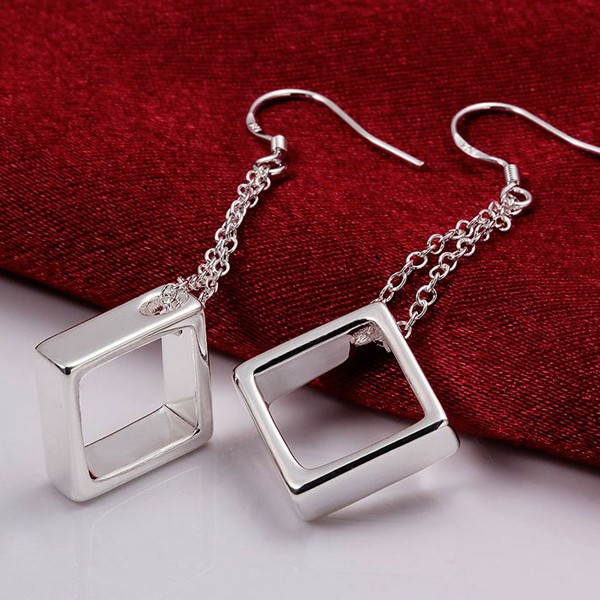 Nádherné postriebrené visiace náušnice s veľkou kockou. Tieto originálne náušnice so zaujímavým dizajnom, doplnia každý Váš výnimočný outfit. Budete s nimi vyzerať jedinečne a neodolateľne. Sú vhodné ako darček k sviatku pre milovanú ženu, alebo dievča. Náušnice aj napriek nízkej cene pôsobia veľmi luxusne a elegantne.