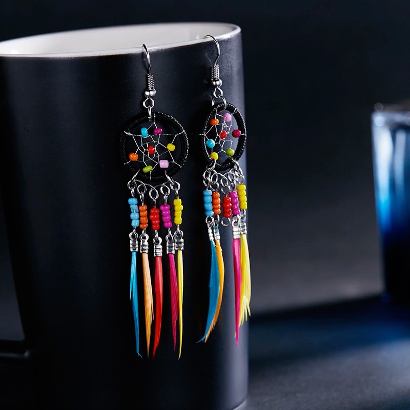 Náušnice lapače snov s pierkami v rôznych farbách. Tieto etno náušnice si zamiluje každá žena. Náušnice sa skladajú z čierneho kruhu s korálkami, na ktorom sú zavesené rôznofarebné pierka. Náušnice sú veľmi štýlové a sú vhodné na záhradnú párty, ale aj na každodenné nosenie.