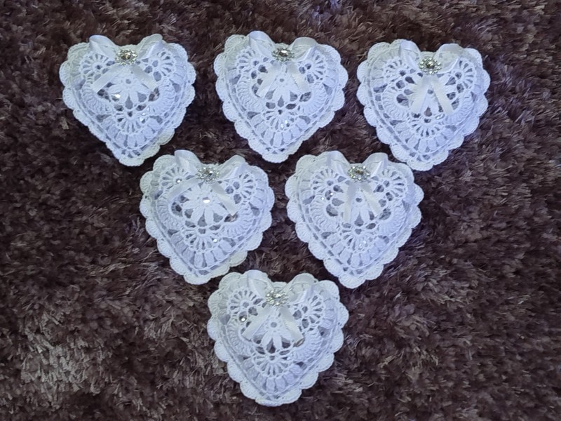 Obháčkované priesvitné plastové srdiečko o priemere 8 cm s uškom na zavesenie na vianočný stromček alebo vhodná len ako dekorácia. Cena za 1 kus je 3,-Eur. Doba dodania závisí od počtu požadovaných kusov.