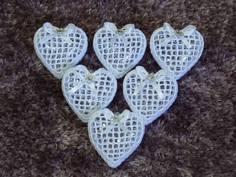 Obháčkované priesvitné plastové srdiečko o priemere 8 cm s uškom na zavesenie na vianočný stromček alebo vhodná len ako dekorácia. Cena za 1 kus je 3,-Eur. Doba dodania závisí od počtu požadovaných kusov.