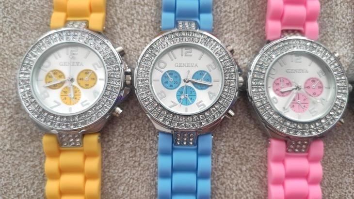 Predám nový typ hodiniek zn. Geneva, ciferník priemeru 4 cm je zdobený po celom obvode krásne sa lesknúcimi kamienkami typu swarovski vo dvoch radoch.