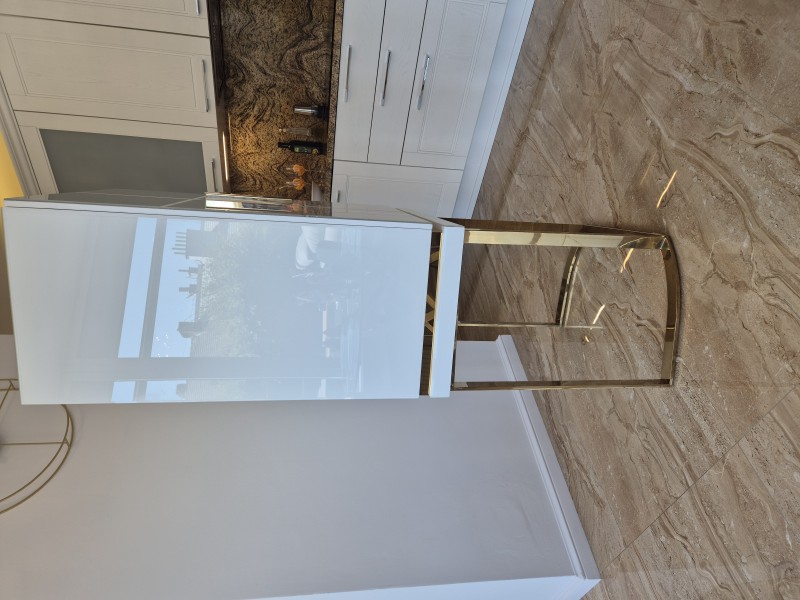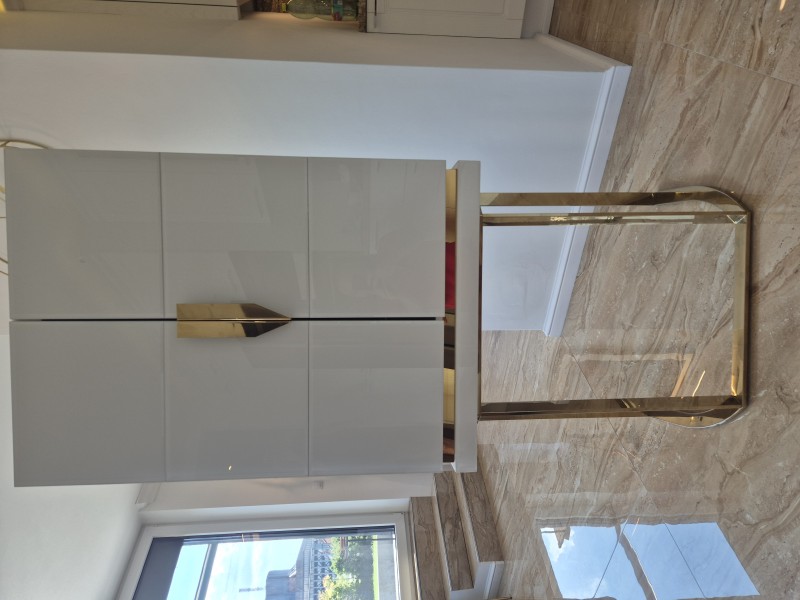 Z dôvodu sťahovania predávam luxusnú dvojdverovú barovú skrinku talianskej značky Vical v štýle art deco. Vonkajšie prevedenie je bielej farby vo vysokom lesku (zvonku drevo pokryté sklom) s lesklými kovovými prvkami zlatej farby. Vnútorná časť je so zadným zrkadlom a predelím s 1 policou.