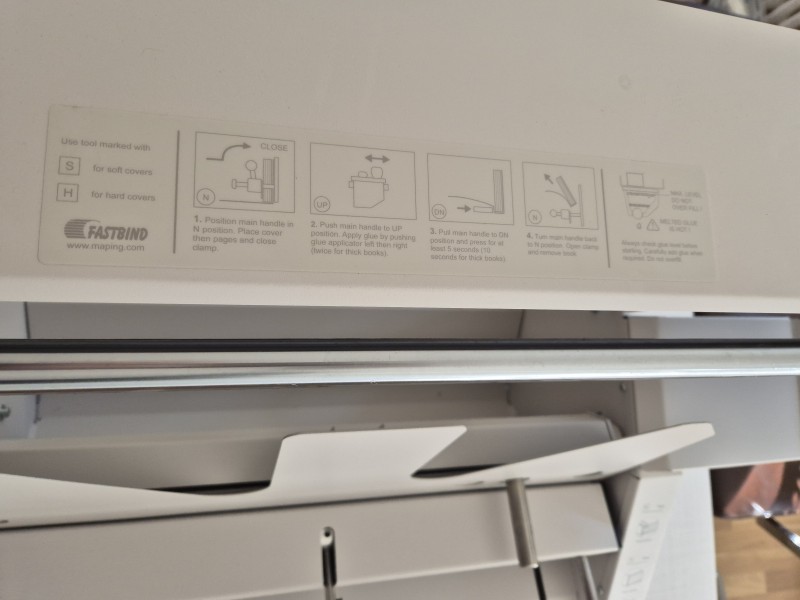 Stroj pre lepenú väzbu do mäkkých a aj tvrdých dosiek, zbrusovacia jednotka, max. dĺžka väzby 455 mm., väzba A4 na šírku (landscape), hodinová produktivita 180 väzieb.