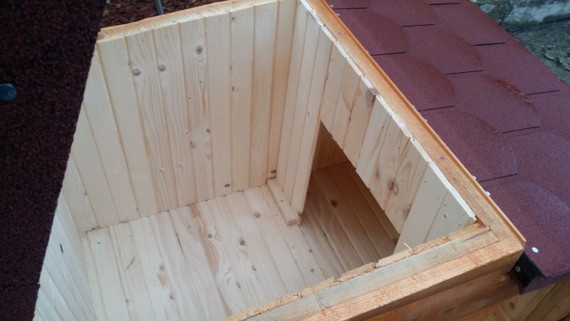 Vyberateľná priečka rozdeľuje búdu na predsieň a spálňu. Čo chráni psa pred nepriaznivými poveternostnými podmienkami. Strecha pokrytá šindľom.